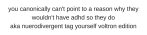 tora42 Uncategorized October 8, 2018December 10, 2018 1 Minute laithen: they all have adhd and you literally can’t prove me wrong as shown by this handy dandy chart Share this: Share on X (Opens in new window) X Share on Facebook (Opens in new window) Facebook Like Loading... Related Published by tora42 View all posts by tora42 Published October 8, 2018December 10, 2018