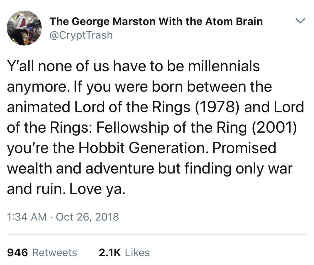 tora42 Uncategorized October 29, 2018December 10, 2018 1 Minute stephendann: Generation Second Breakfast, aka Generation Hobbiton Share this: Share on X (Opens in new window) X Share on Facebook (Opens in new window) Facebook Like Loading... Related Published by tora42 View all posts by tora42 Published October 29, 2018December 10, 2018