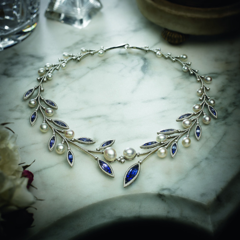 “Inspired by the 1930s era in which the Paspaley story began, this couture necklace  design reinvents old world glamour with sophisticated modern edge. Royal shades of marquise shaped tanzanites and pure keshi pearls emulate a figurative olive branch through these artistic creations “