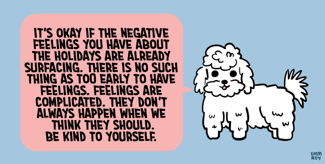 [Drawing of a white bichon frise saying “It’s okay if the negative feelings you have about the holidays are already surfacing. There is no such thing as too early to have feelings. Feelings are complicated. They don’t always happen when we think they should. Be kind to yourself.” in a pink speech bubble.]