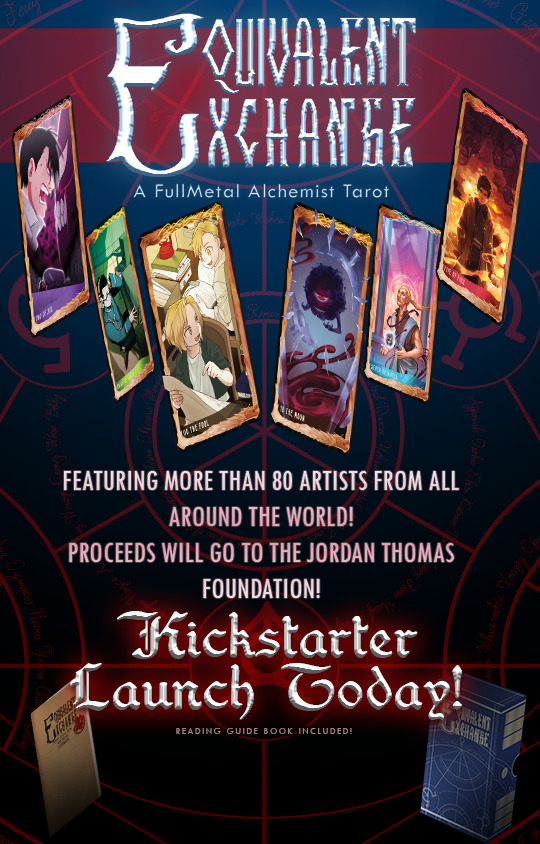 Equivalent Exchange Tarot is the passion project of over 80 artists and writers brought together by our love for Fullmetal Alchemist. This full tarot deck serves as both a beautifully crafted set of art cards and as a divination tool for those who practice Tarot.